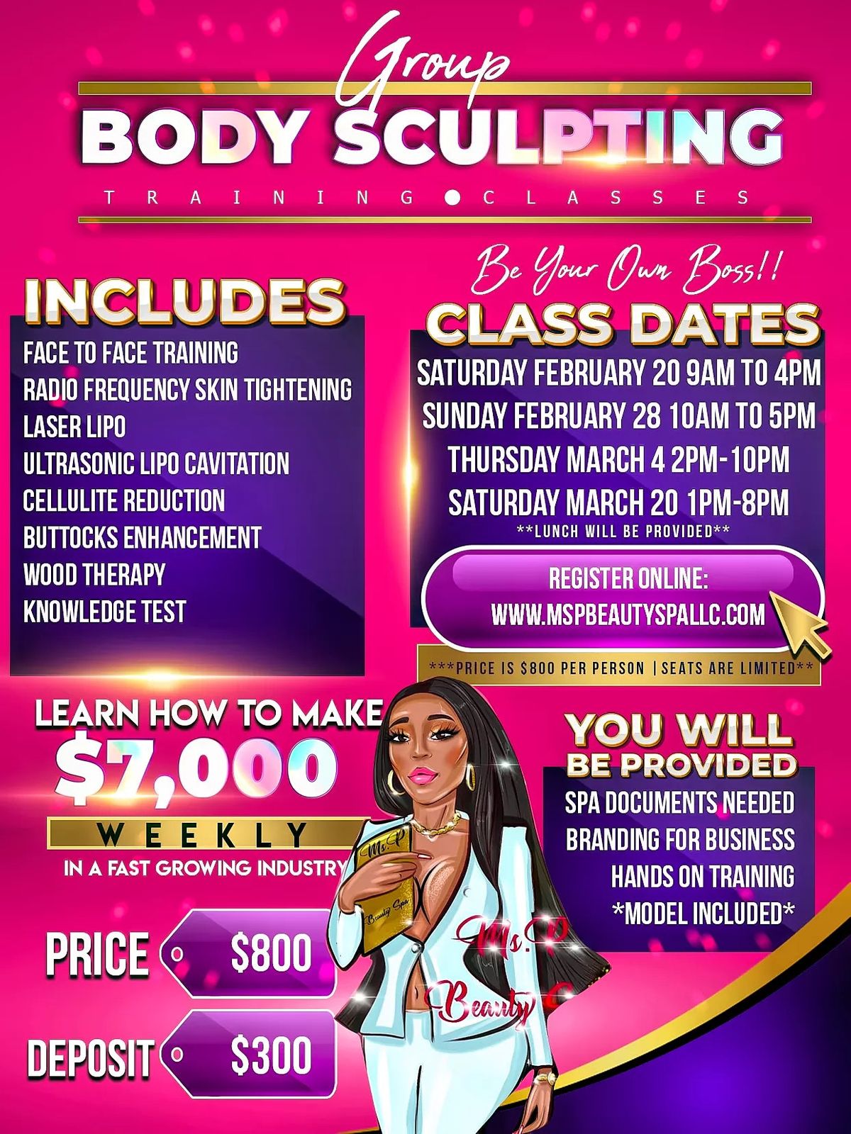 For our short courses, we will provide an academy of advanced aesthetics diploma. This course is open all to health care professionals, esthetician, and all of them looking for expand their practice in aesthetic body treatment. This will enable you to gain insurance and to commence work legally to perform these treatments in the public sector. Education on frequencies and amplitudes. $1,500.00 class (without machine package) , $500.00 deposit $3,000.00 class (w/ 5 in 1cavitation, laser lipo & vacuum therapy machine , $1200.00 deposit $3,500.00 class (w/cavitation & vacuum therapy machines, detox sauna blanket &.